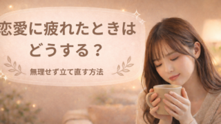 恋愛の悩み 恋愛に疲れたときはどうする?無理せず立て直す方法 恋愛に疲れてしまったとき、どうすればいい?無理して続ける必要はありません。この記事では、疲れた心を整える方法と無理せず立て直す考え方をわかりやすく解説します。 2026.04.05 恋愛の悩み